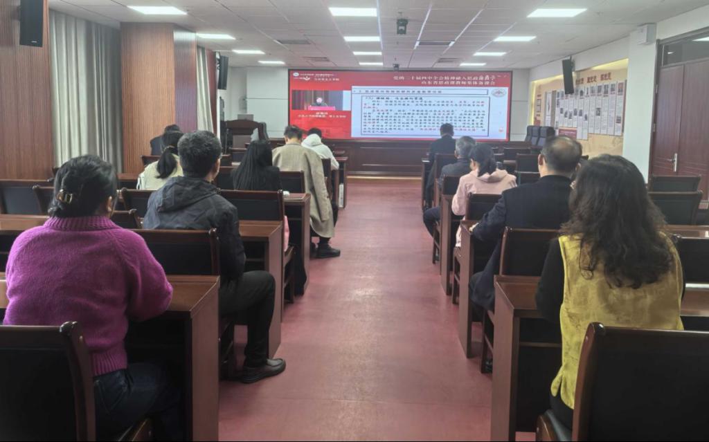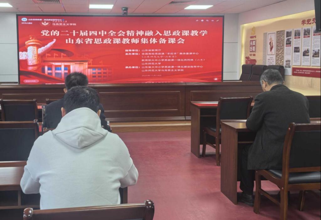 为深入贯彻党的二十届四中全会精神,推动思政课教学内容的创新与深化,11月14日上午,学校组织全体思政课教师在汇智楼八楼会议室观看了山东省教育厅组织的党的二十届四中全会精神融入思政课教学集体备课会直播。