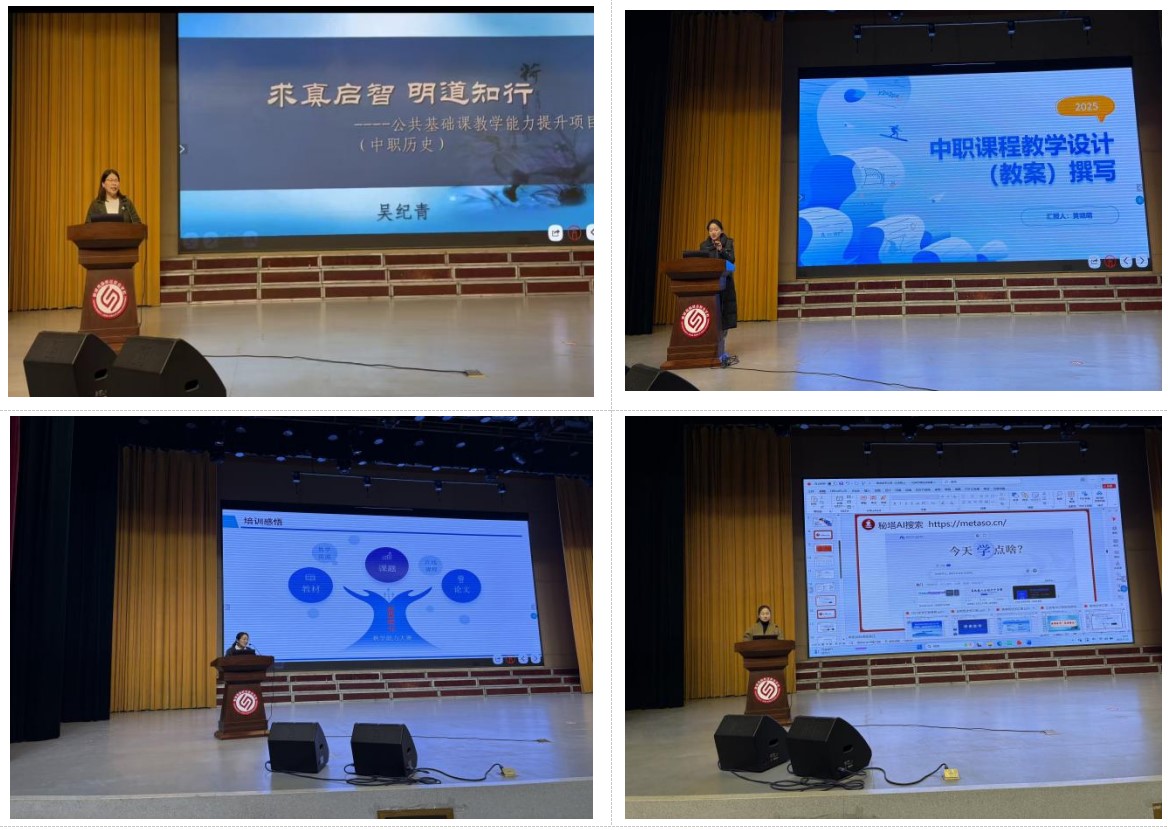 在汇报环节,四位教师结合培训所学,聚焦不同主题进行了凝练而深入的分享。王淑娟老师围绕ai辅助教学工具,解析了其功能优势与实际应用场景,并进行具体操作演示;白艳旭老师以教学能力大赛备赛为主线,从选题策略、团队组建到实施报告撰写等关键环节,系统分享了备赛经验与实用建议;黄晓萌老师聚焦思政课教学能力提升,从中职学情分析出发,深入阐述了教学设计中教学目标确立、教学重难点把握及教学环节设计的系统性方法;吴纪青老师则紧扣历史课教学实际,强调以深耕课程标准为基础,详细介绍了在课堂中落实核心素养、提升教学效能的具体路径与实践思考。