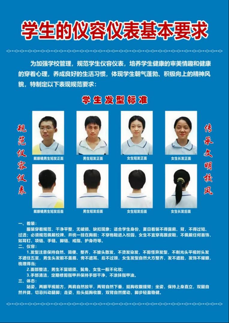 2.发型:男生不留长发,不剃光头,不留怪异发型,不得烫发、染发;女生不得披散发,不留怪异发型,不得烫发、染发。