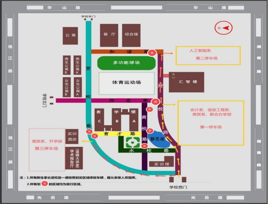 报到学生统一在学校西门入校。为方便学生家长,机动车辆允许入校,车速需控制在10千米/小时并按划定的区域停放,配合工作人员现场指挥。